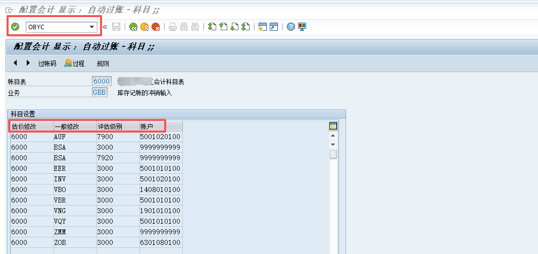 总账科目是财务记账的最终结果,通过 OBYC 配置与"事务键+科目修改+评估类+评估分组"的组合绑定。其中: