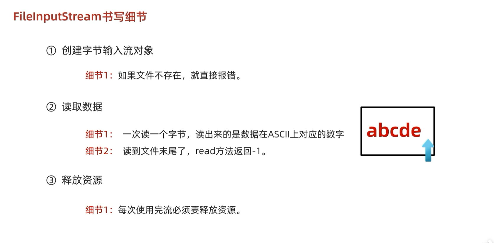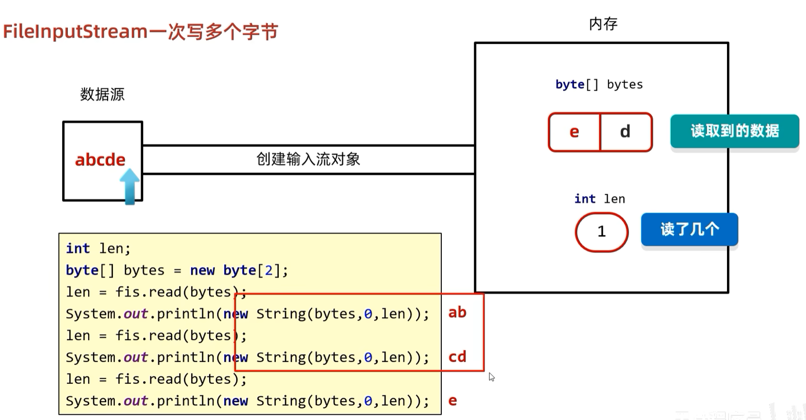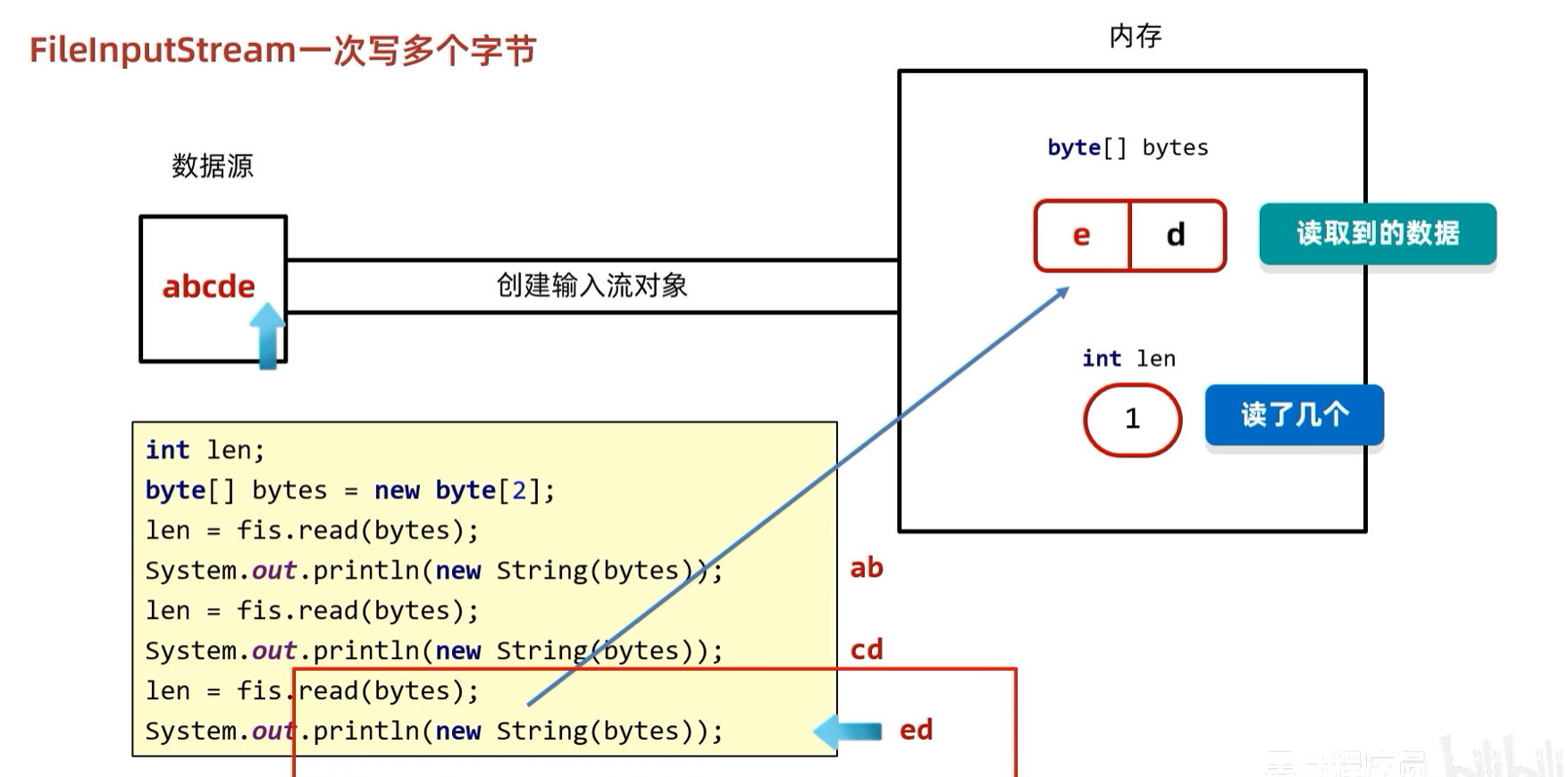 这里变量len是记录了读取了多少个数据,创建的bytes数组记录的才是真正的数据。第一次尽可能的读满数组,读取两个数据,将a和b记录到了数组当中。第二次,尽可能的读满数组,读取c和d到数组当中,数组原来的a和b因此被覆盖。第三次,只能读到一次数据e并且旧有的数据c覆盖了,而旧有的d因为没有新的数据被读取到覆盖而保留。第四次则是没有读取到数据,len返回-1。
