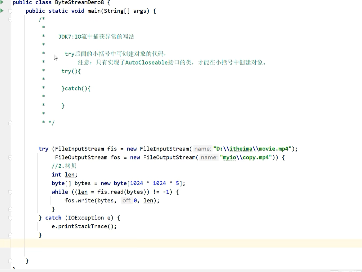 /* 利用try...catch..finally捕获拷贝文件中代码出现的异常 */