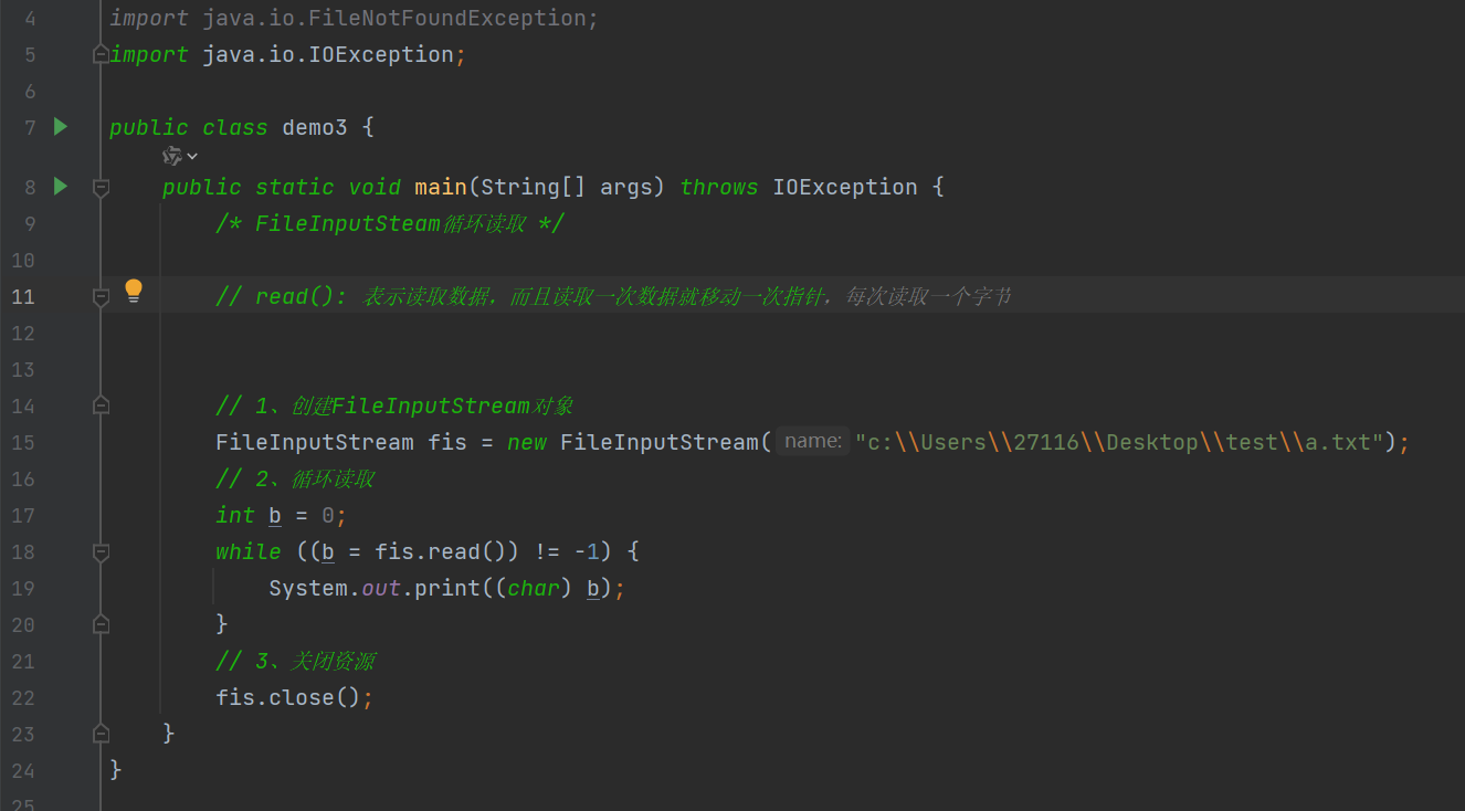 FileInputStream fis = new FileInputStream("c:\\Users\\27116\\Desktop\\test\\a.txt");