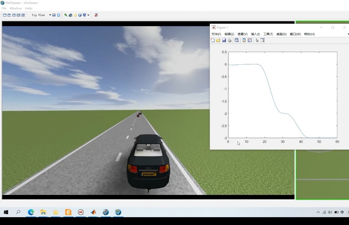 跑起来后能看到车辆在Prescan的3D场景里蛇形走位,避开随机出现的障碍物(效果类似真人版贪吃蛇)。