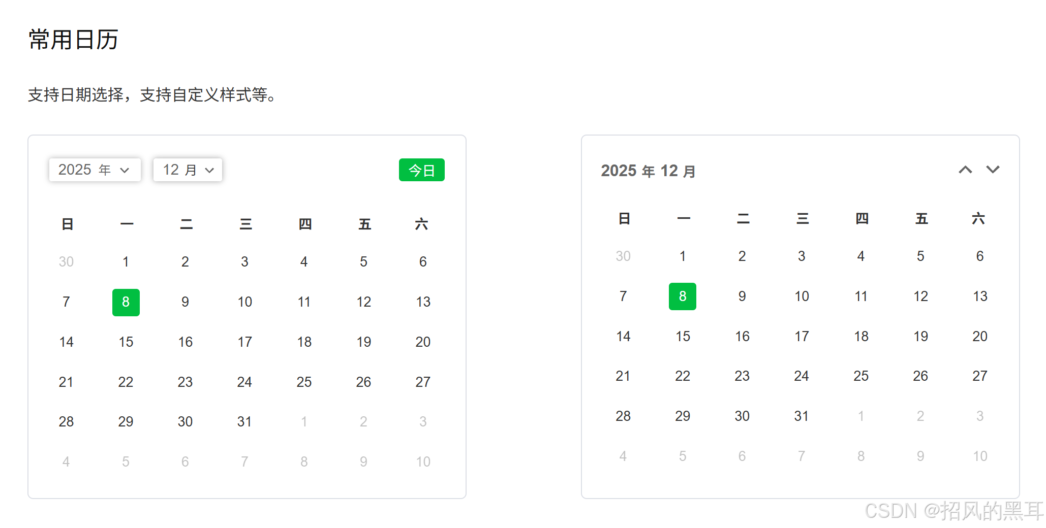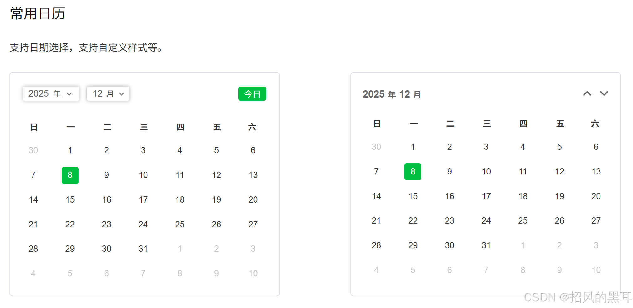 默认选中当日:组件在加载时会自动选中当前日期,提升用户体验。