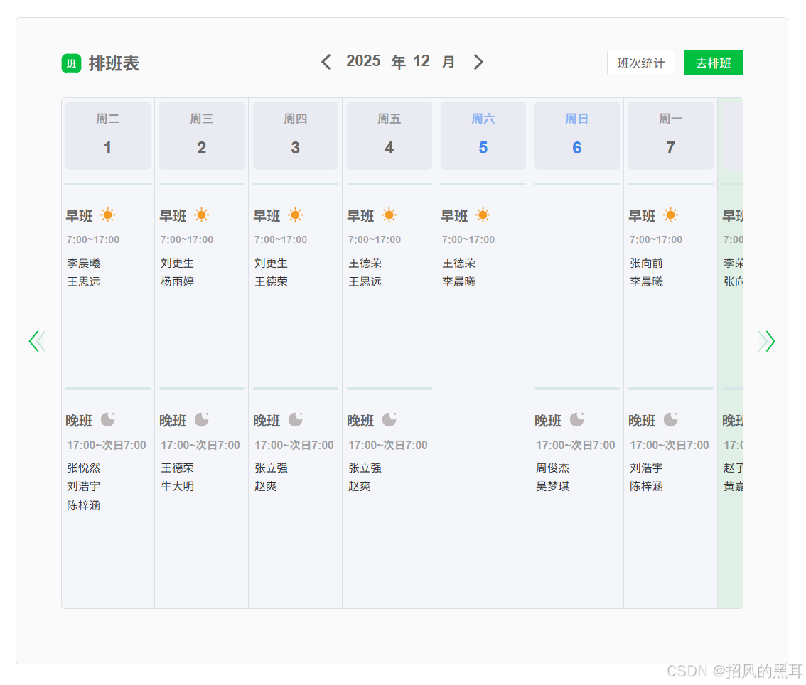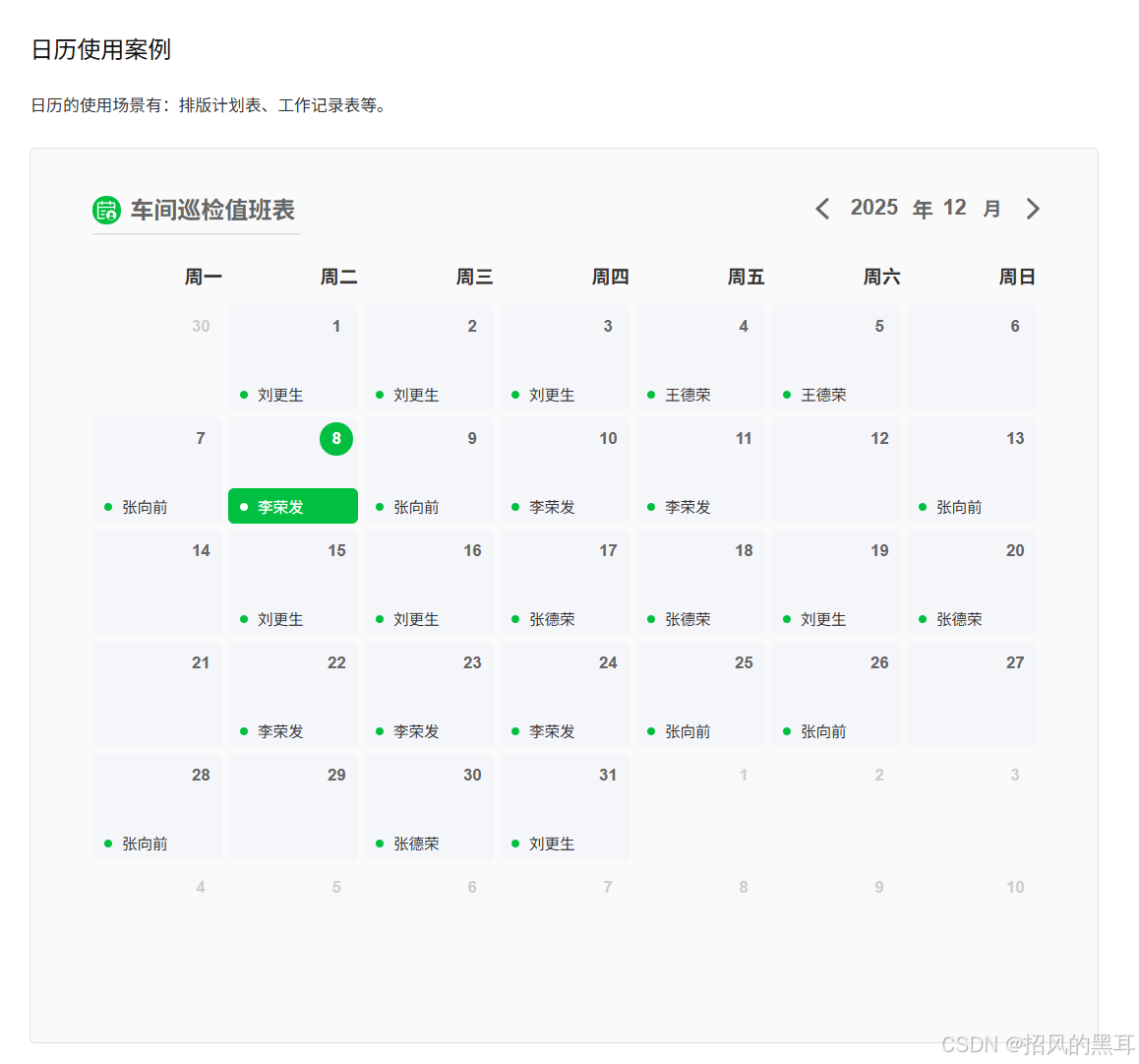除了基本的日期选择功能外,这款日历组件还可以进行扩展,以制作排班表为例: