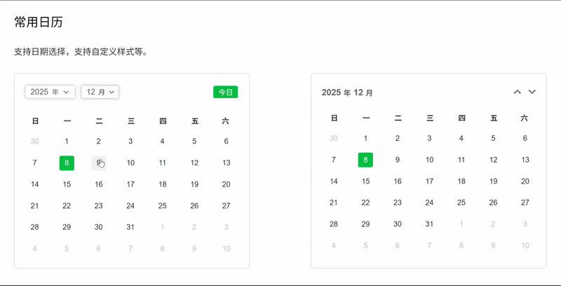 日期选择:用户可以直接点击日历上的日期进行选择,选中的日期会以高亮或其他视觉反馈形式显示。
