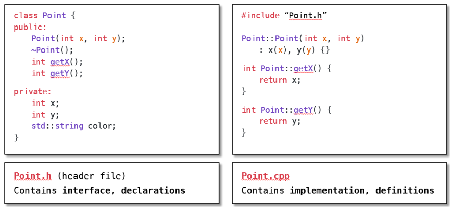 | 包含内容(Contains) | 函数原型、类声明、类型定义、宏定义、常量 | 函数实现、可执行代码 |