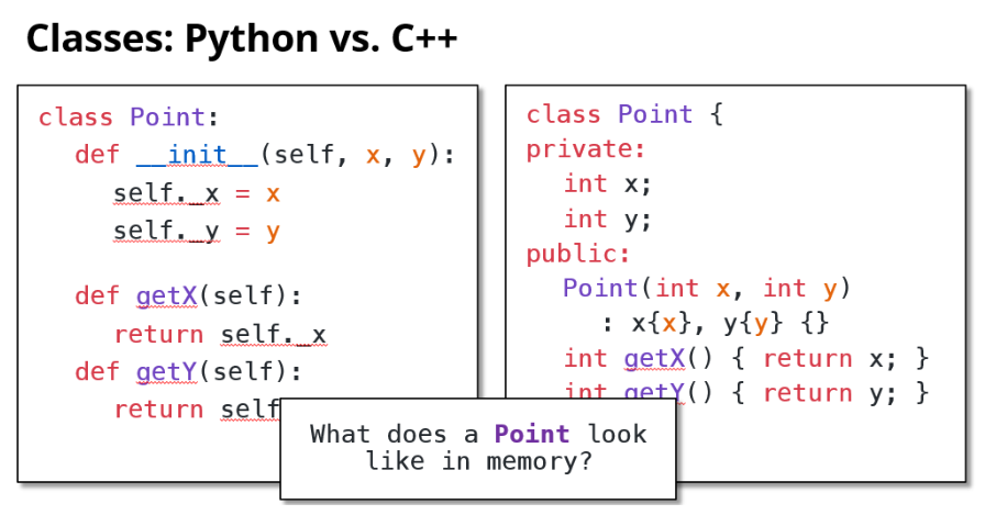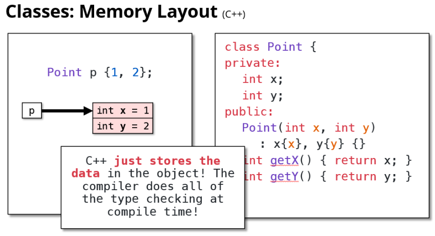 但C++不会,C++只在对象中存数据。类型检查全部交给编译器。