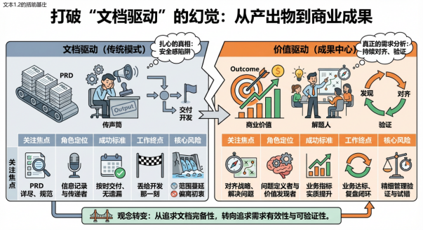 错误地把"输出了文档(Output)"等同于"创造了价值(Outcome)",导致整个团队为文档忙碌,而不是为业务结果负责。