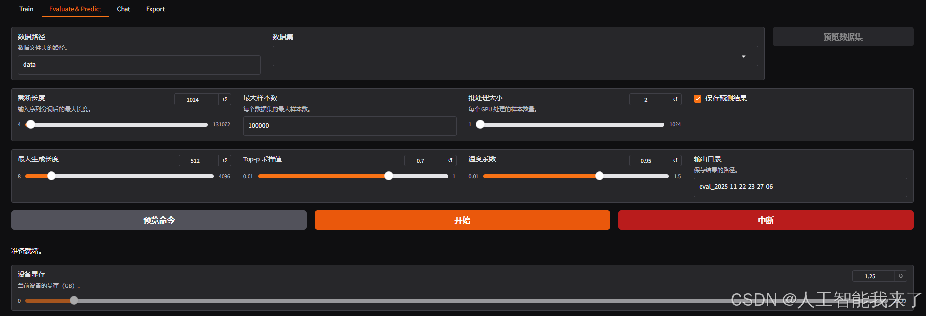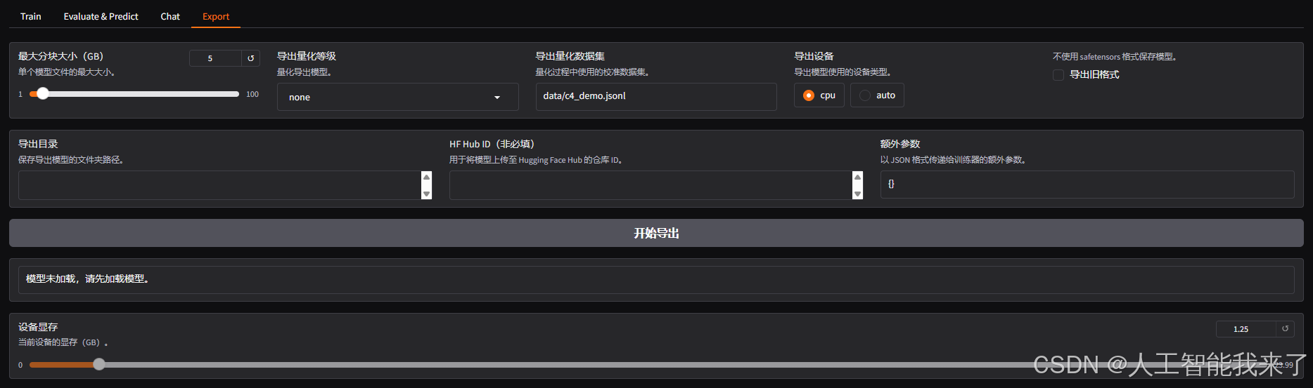 - 模型导出:可以指定模型、适配器、分块大小、导出量化等级及校准数据集、导出设备、导出目录等。