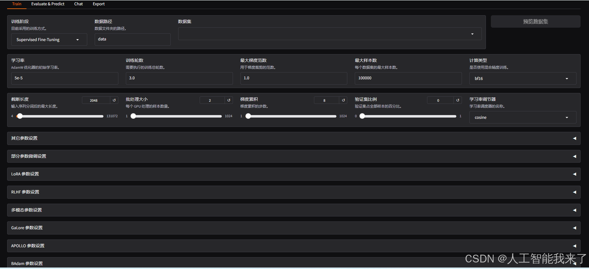 - RLHF 参数:当训练阶段为强化学习时需要配置的一些特殊参数;
