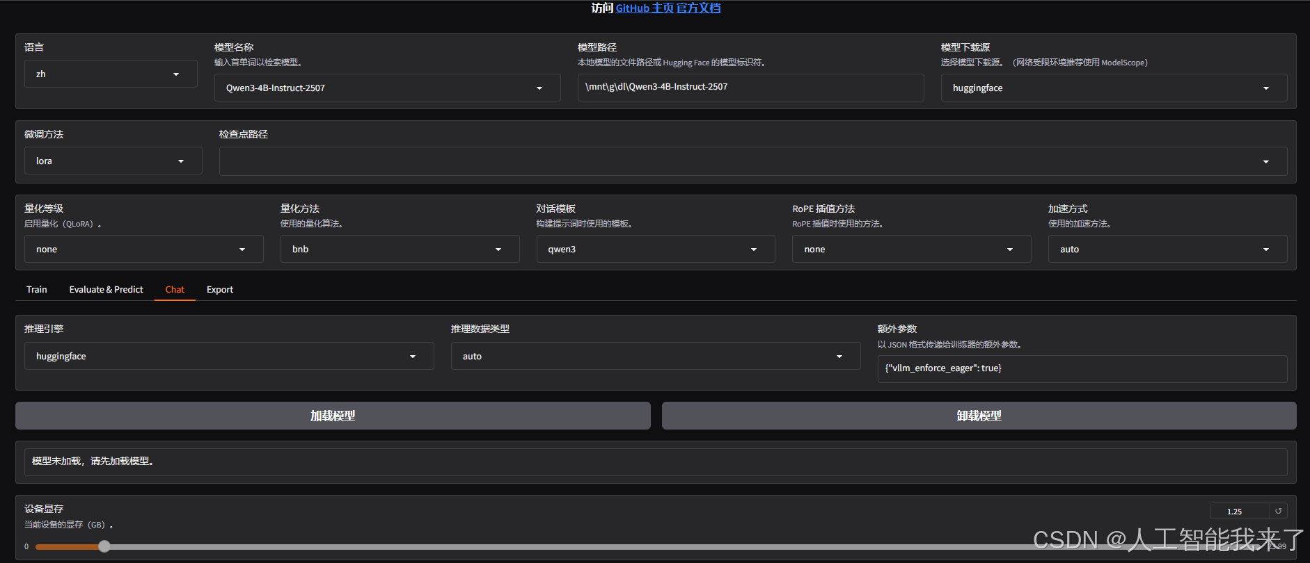 - 在线推理:可以选择使用 huggingface、vllm 等推理引擎和模型在线聊天,主要用来测试加载模型: