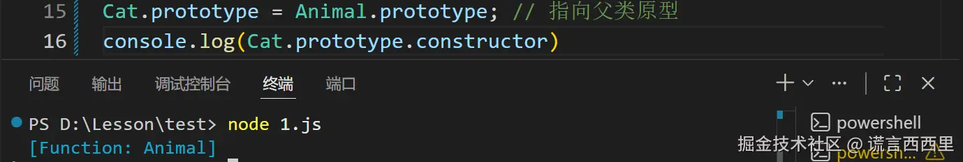 而当我们在代码中执行console.log(Cat.prototype.constructor)最后得到的结果却是 Animal