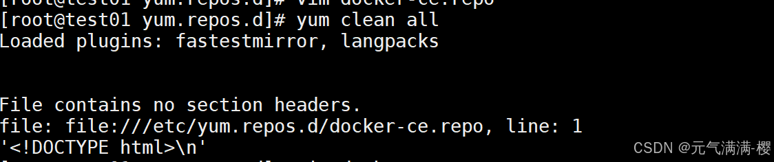 1、在yum clean之后提示文件内容有错误信息,这个可能是在下载docker-ce yum源的时候,访问的 URL 跳转到了 Docker 官网的网页(而非直接的 repo 配置文件),删除repo文件,重新下载阿里云的dockeryum,yum-config-manager --add-repo https://mirrors.aliyun.com/docker-ce/linux/centos/docker-ce.repo