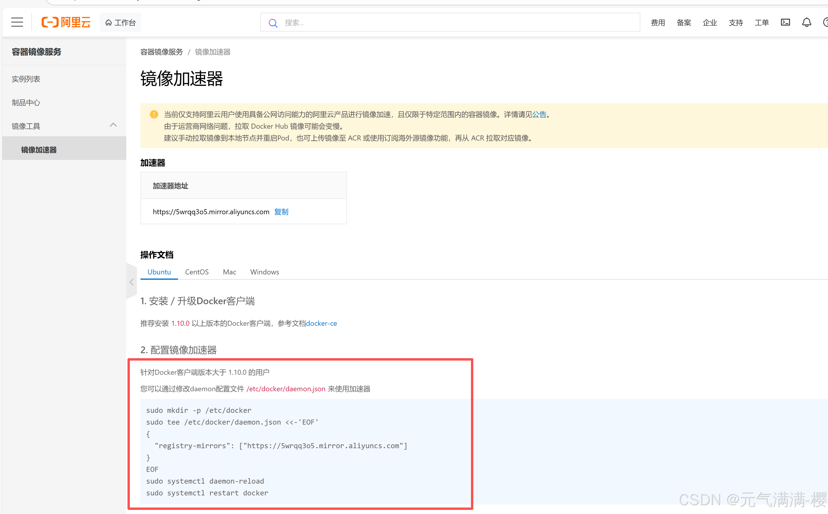 为什么要配置镜像加速器?因为docker的镜像仓库是在国外,不配置加速器会导致在拉取镜像的时候超时,网络不稳定,拉取速度慢等问题