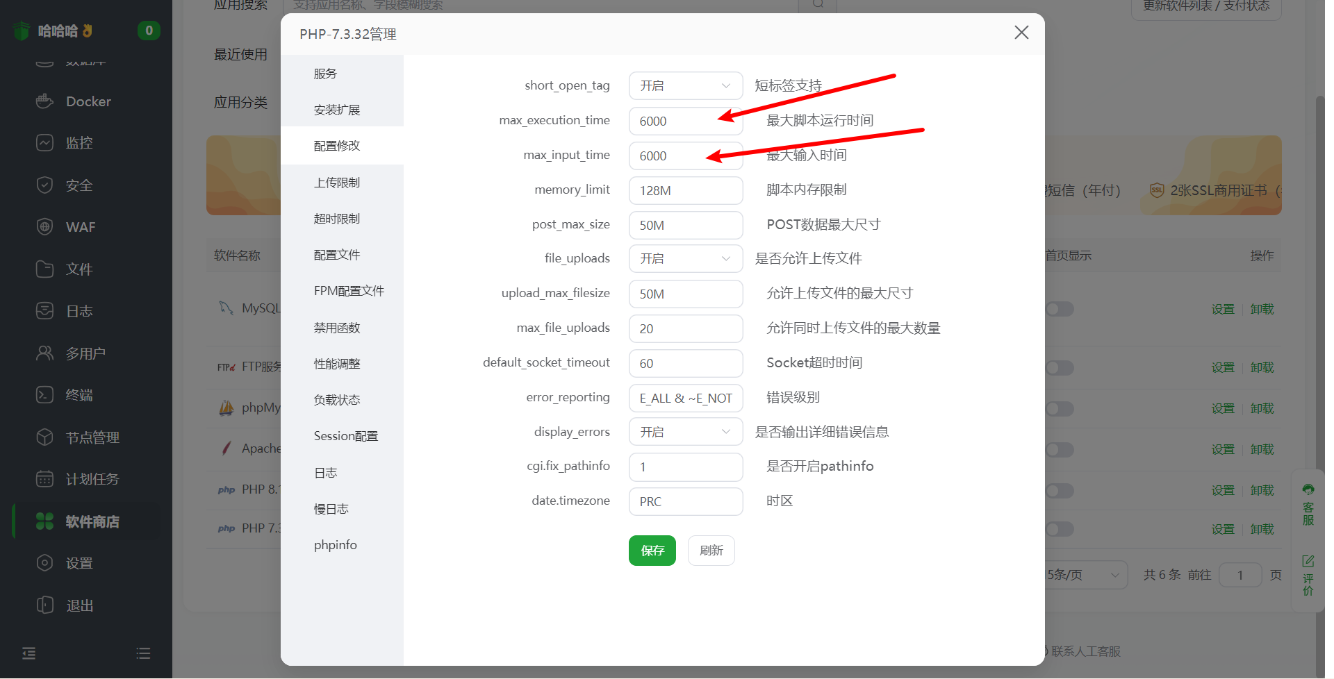 如果你是云端建站,可以在宝塔面板的左侧打开"软件商店",点击"已安装",在列表里找到PHP,点击设置。在弹窗左侧点击"配置修改",把这里的"最大脚本运行时间"和"最大输入时间"也改大一点,比如6000。