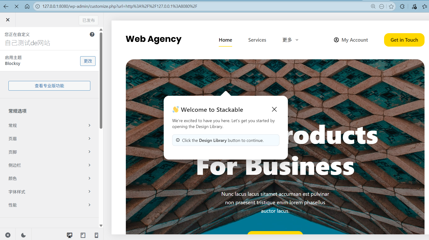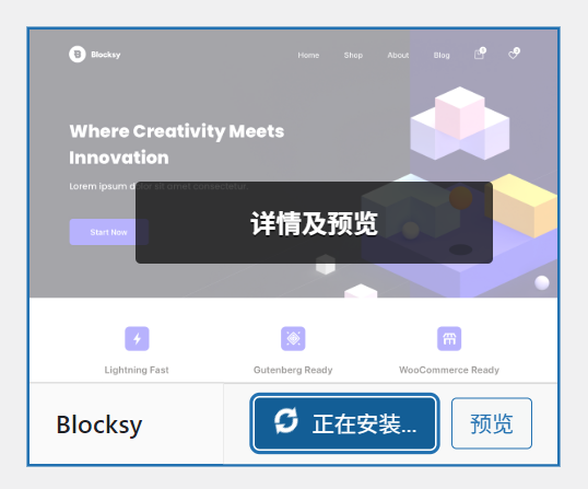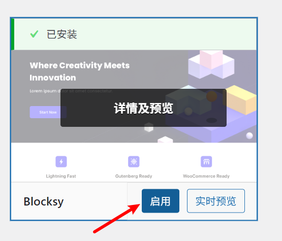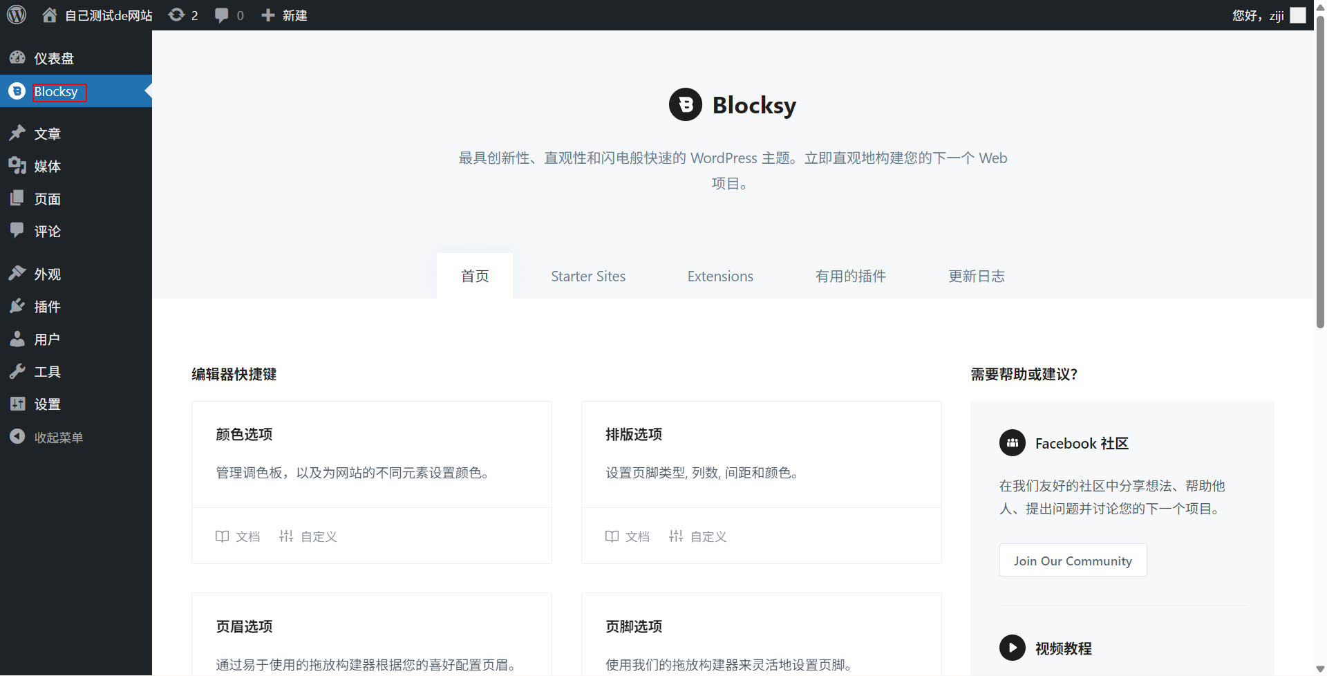 点击安装,安装完成后插件会自动启用。这时,管理后台的左侧菜单中就会出现一个"Blocksy"的选项,右侧是一个新的页面。