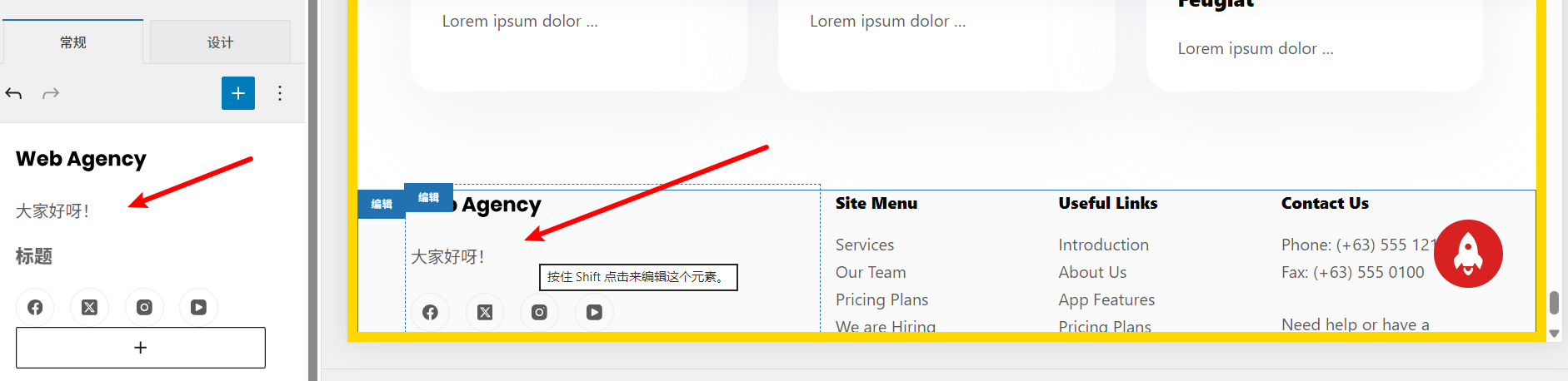 根据你自己的需求设置好每一行的列数和列宽之后,你可以点击底部编辑区域里的这些元素。左侧编辑菜单中就会跳转到对应的编辑区域,你可以在这里对上面的文字进行修改。