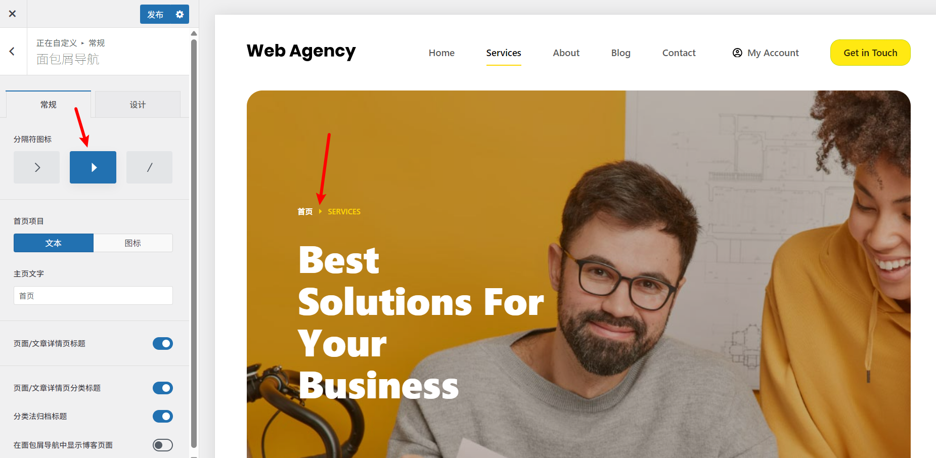 后面还有一个"面包屑导航"。什么是面包屑呢?这个词应该是翻译的问题,但是它一般指的是页面路径的导航。比如随便打开一个子页面,这里就会显示"首页"和当前的页面。你可以修改这里的分隔符,把它改成三角形或者斜杠。在"设计"选项卡中也可以修改字体和颜色。