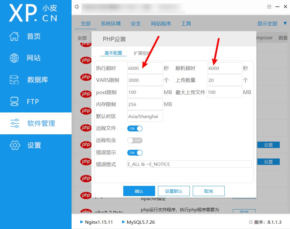 如果你是本地建站,可以打开PHP Study,在软件管理中找到PHP(默认使用的是7.3版本),点击设置,把里面的"执行超时"和"解析超时"都改大一点,比如这里我都改成6000。
