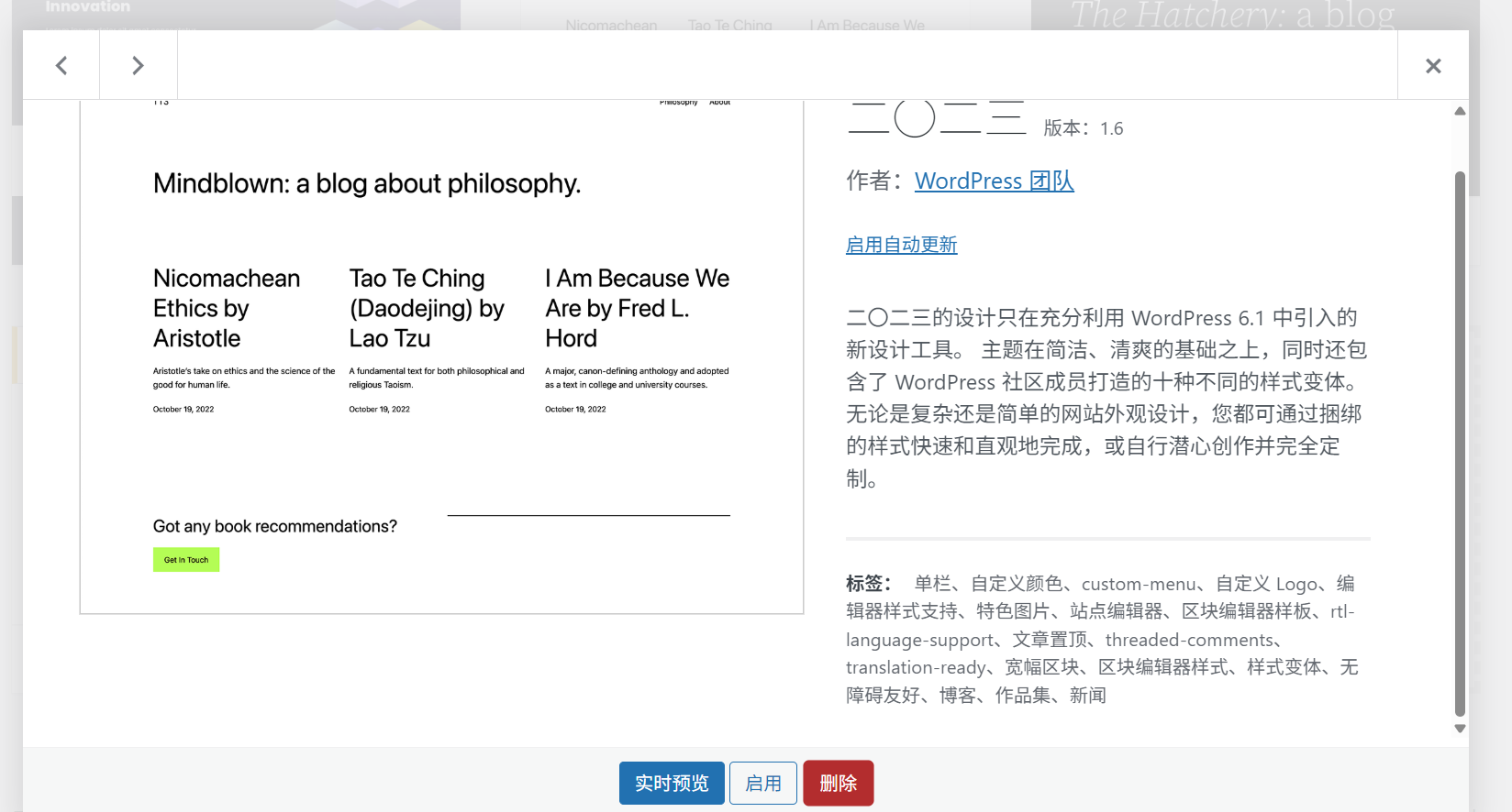 回到主题列表,这里显示我们已经启用了Blocksy主题。下面这些默认的主题就可以分别点击它们,然后删除掉。