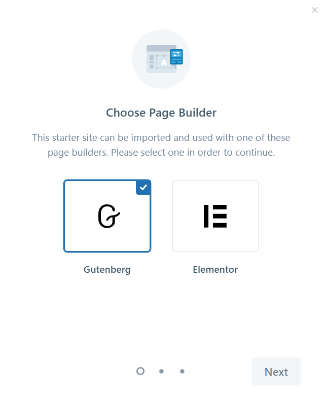 弹窗里首先需要选择安装子主题,然后点击下一步。这里会让你选择网站编辑器,编辑器其实也是插件,这些插件可以帮助你可视化地编辑网站。默认选择的是Gutenberg(古腾堡编辑器),另外一个是Elementor。推荐使用默认的古腾堡编辑器,Elementor可以搭配前面介绍的Astra主题一起使用。继续点击下一步,模板就会自动开始安装了。
