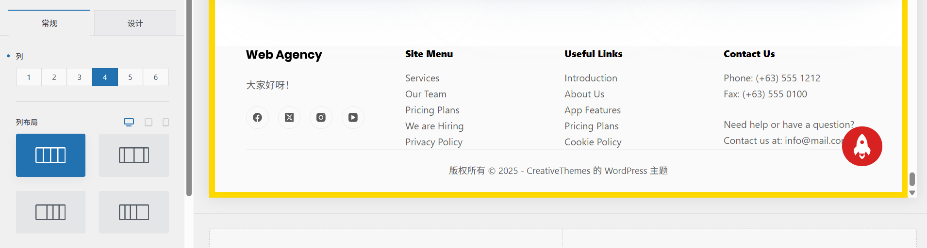 设置好了顶部导航栏,也就是"页眉"这一部分,我们再来看看"页脚"。这一部分就是网站的最底部,它的设置方式跟页眉很类似。首先看一下底部这个编辑区域,它会有三个"行",分别是顶部行、中间行和底部行。你可以点击每一行左上角的设置按钮,左侧菜单就会切换到针对当前行的设置选项。你可以设置这一行有多少列,然后根据下方的图示来选择这些列所占的空间分别是多大。比如可以让第一列更宽一些,剩下的列平均排布,或者是所有的列全部平均排布。