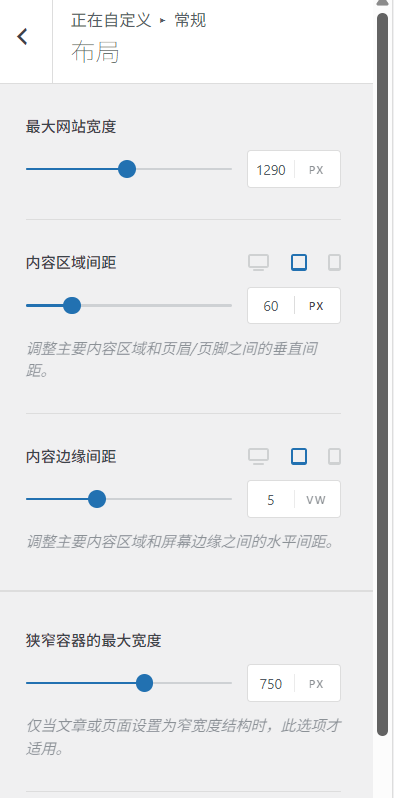 这里可以调整网站的最大宽度、内容间距等参数。你可以尝试修改这些参数,看看网站会发生怎样的变化,把网站上的内容调整到合适的距离。某些设置项的顶部会有三个图标,分别代表了电脑端、平板端、手机端。当你点击这些按钮后,右侧的网站效果就会变成对应设备的显示效果。可以通过这三个按钮单独对电脑端、平板端或者手机端的内容进行设置。