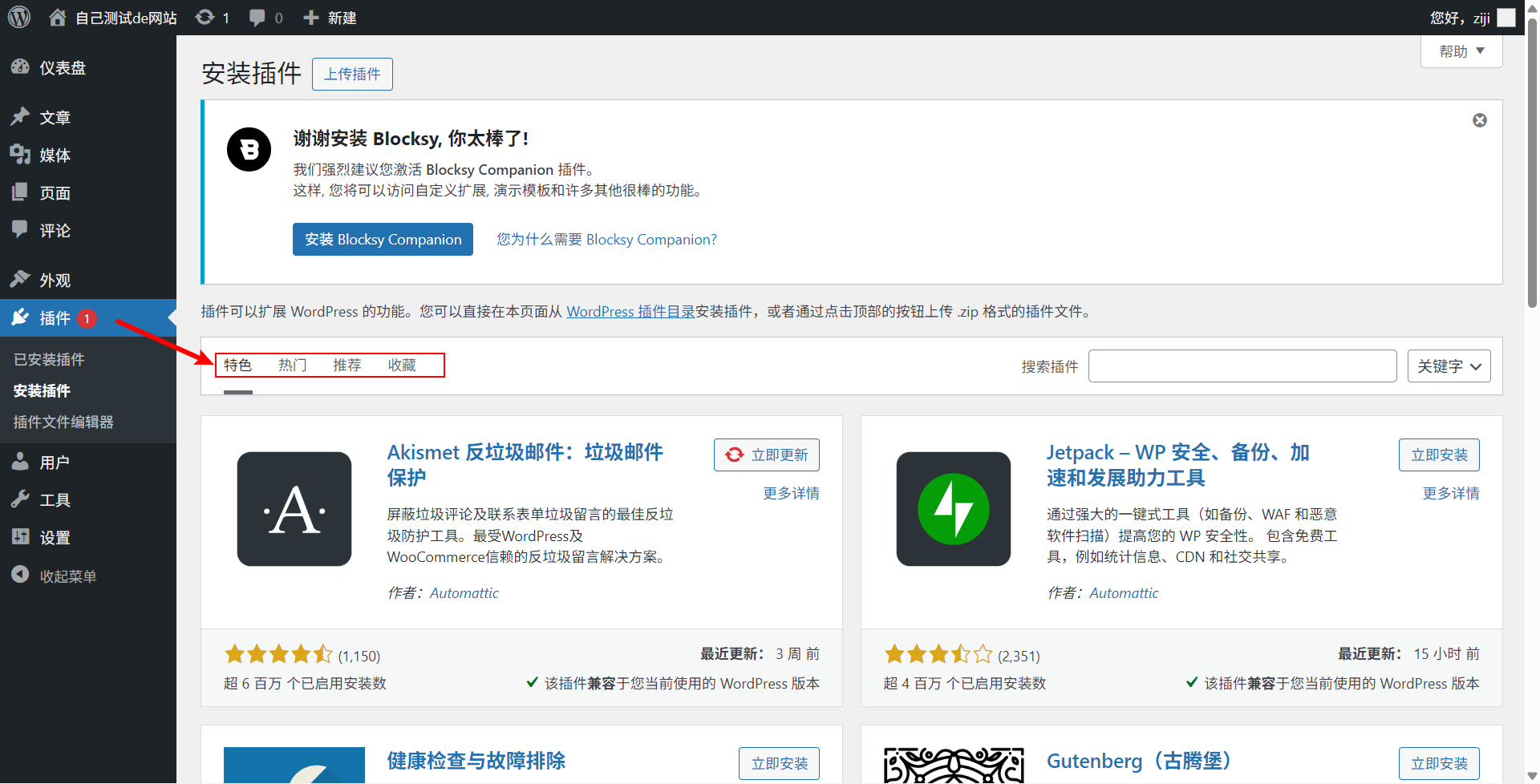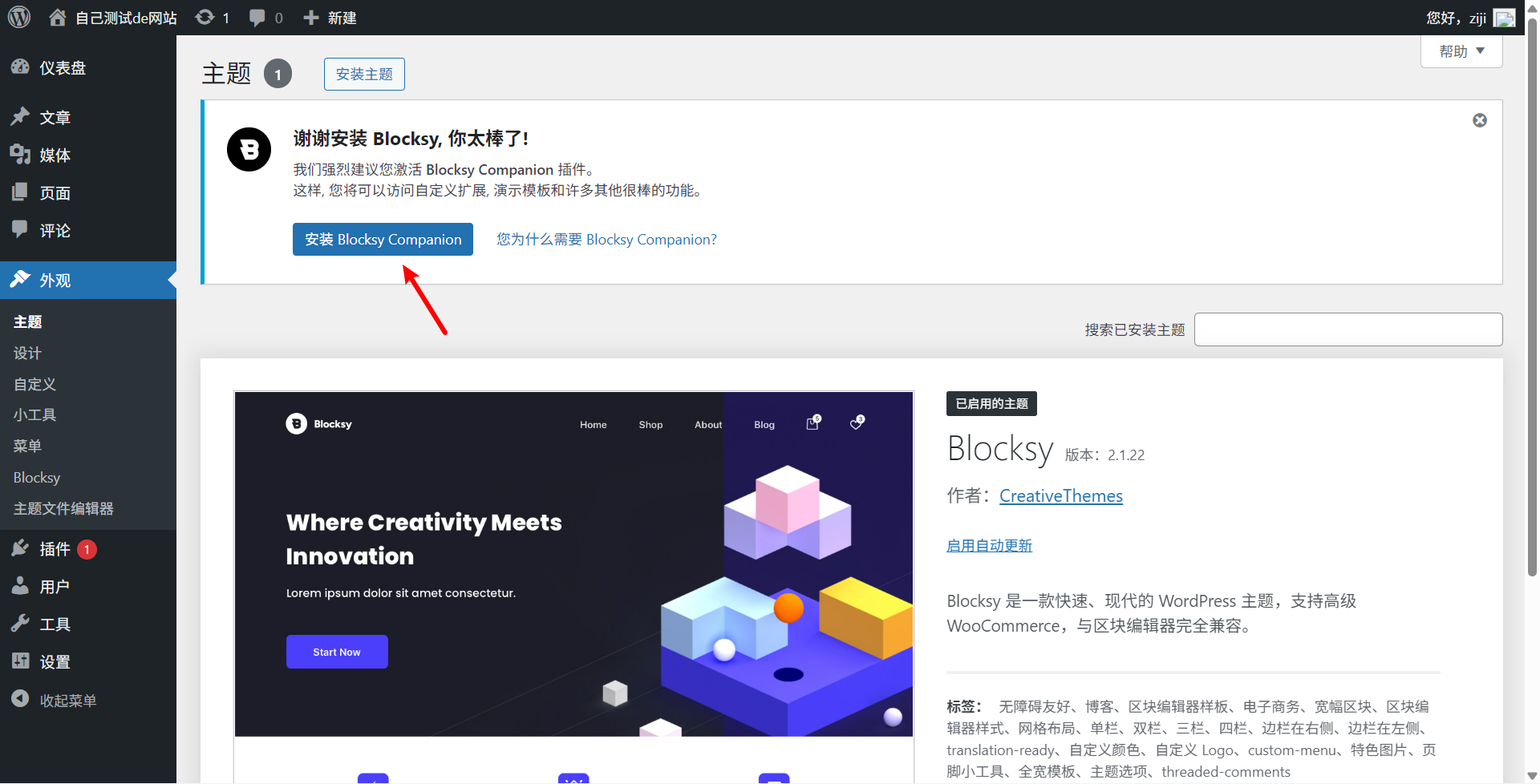 启用Blocksy主题后,在顶部会有一个提示,安装"Blocksy Companion"(Blocksy伴侣)这款插件。