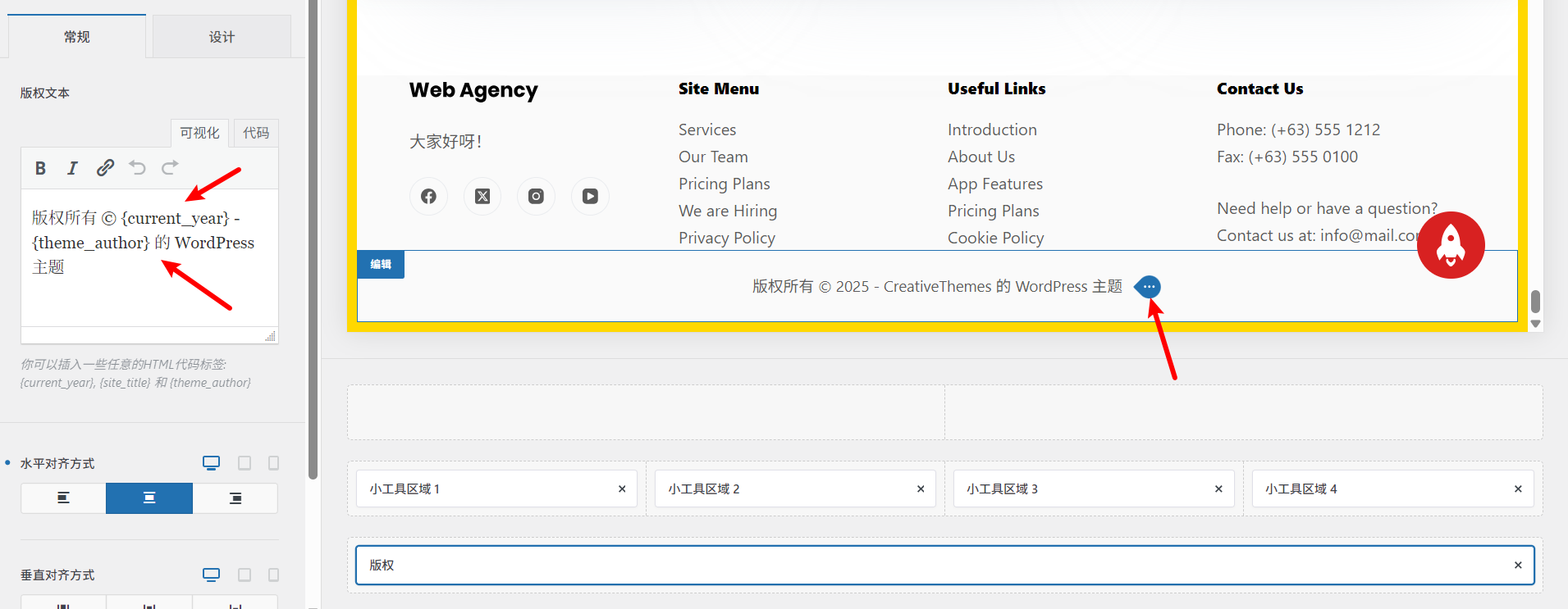 比如你可以修改底部的版权信息。这里的文本里面会有一些标签,它们是用花括号{}包裹起来的。例如"{current_year}"代表的就是当前的年份,这个标签会自动调用当前的年份然后更新在网站上,就不需要你自己手动更新了。其他标签的原理跟这个类似。