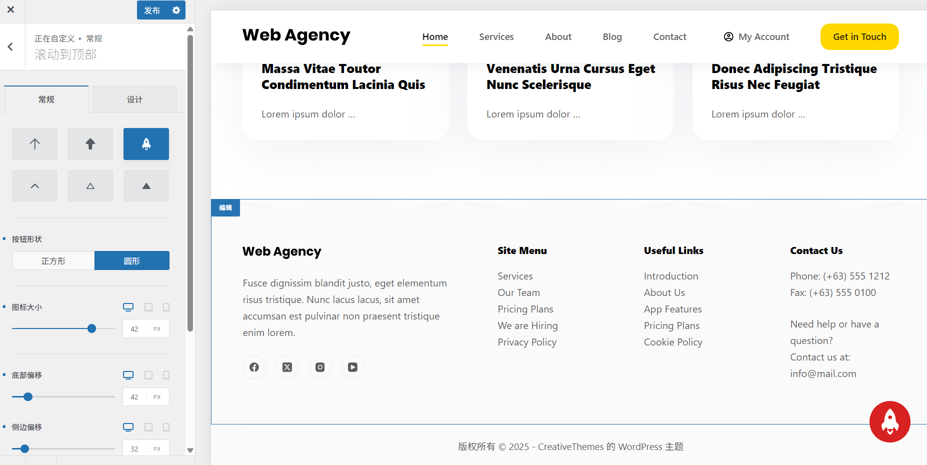 启用"滚动到顶部"开关,当你向上滑动网站时,右下角会出现一个箭头按钮。点它,页面就会自动滚动到顶部。你还可以修改这个按钮的样式,比如把它改成一个小火箭,或者其他的图形。按钮的形状默认是正方形,你也可以把它改成圆形。还可以调整按钮的大小和位置,这些都很好理解。
