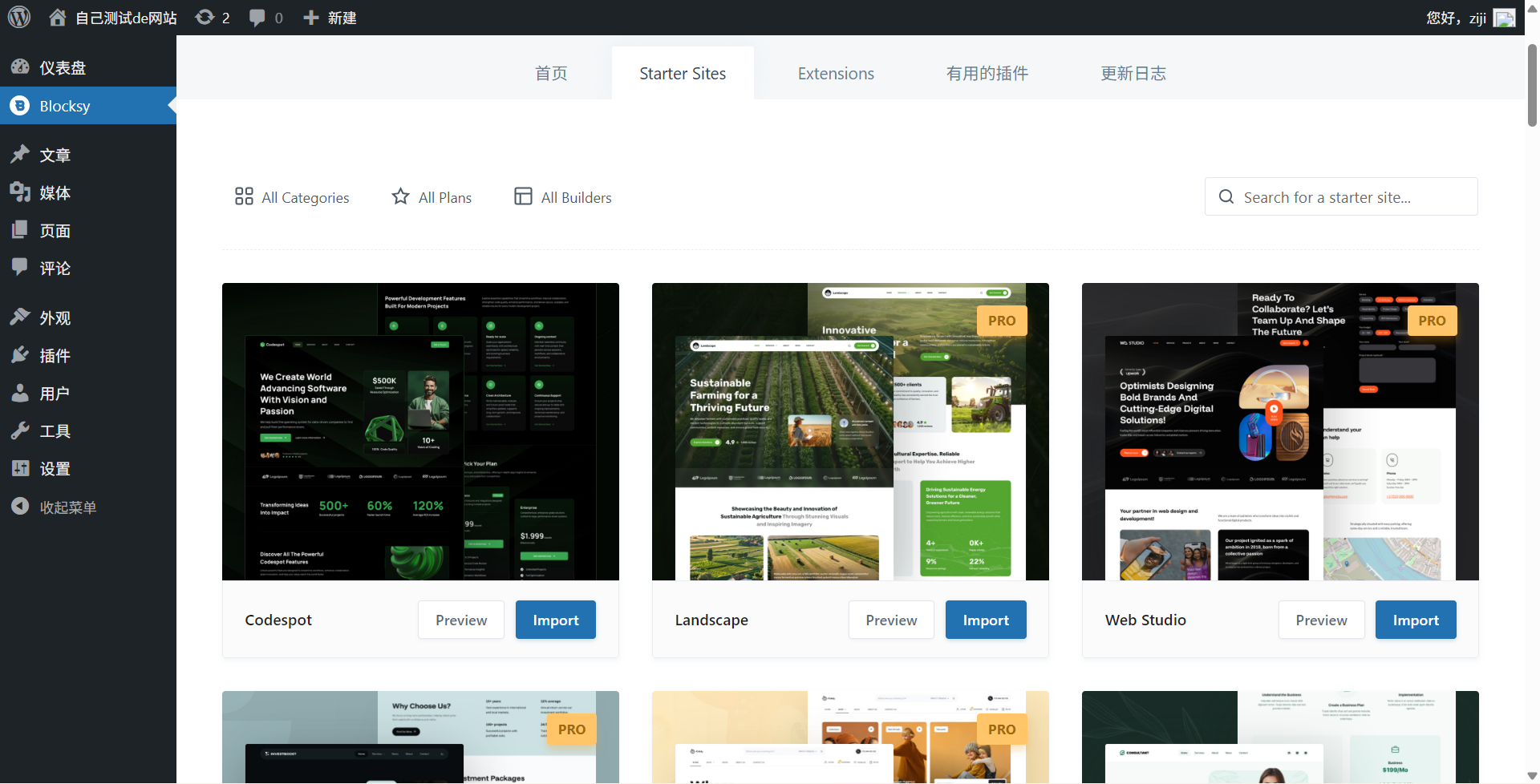 如果变成了你自己设置的6000,那么再点击左侧的Blocksy,在"Starter Sites"里面找到需要的模板,点击"Import",这样主题就可以正常安装了。