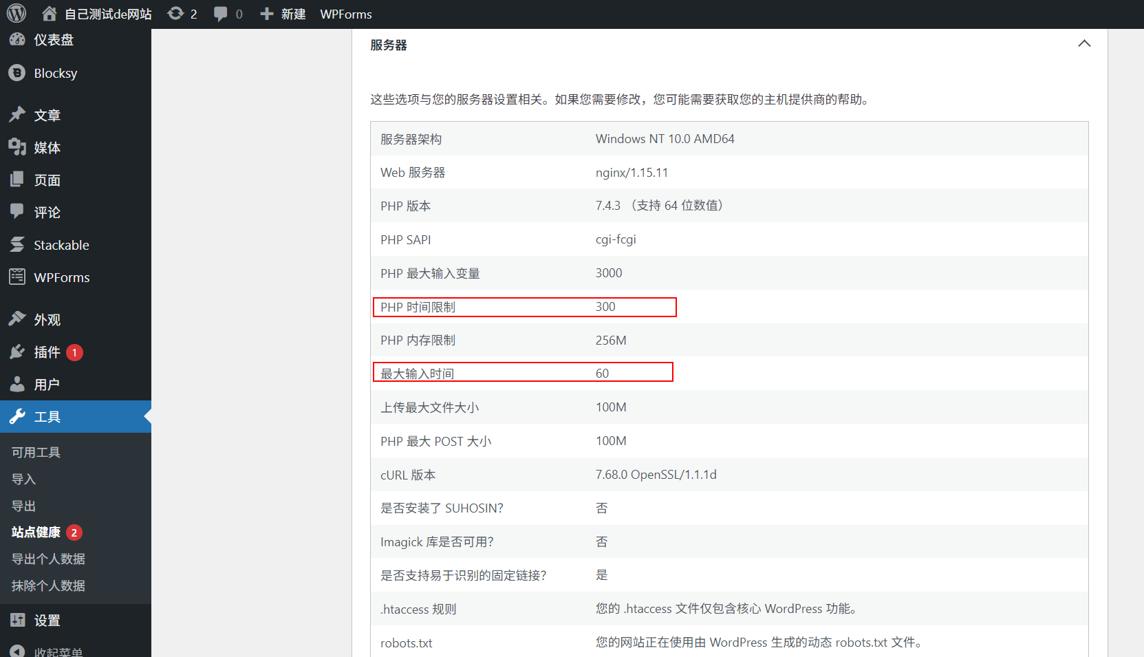 你可以点击左侧的"工具"菜单,找到"站点健康",在"信息"里找到"服务器"。可以看到PHP时间限制是300,最大输入时间是60,这些配置参数太小会对模板的安装产生影响。