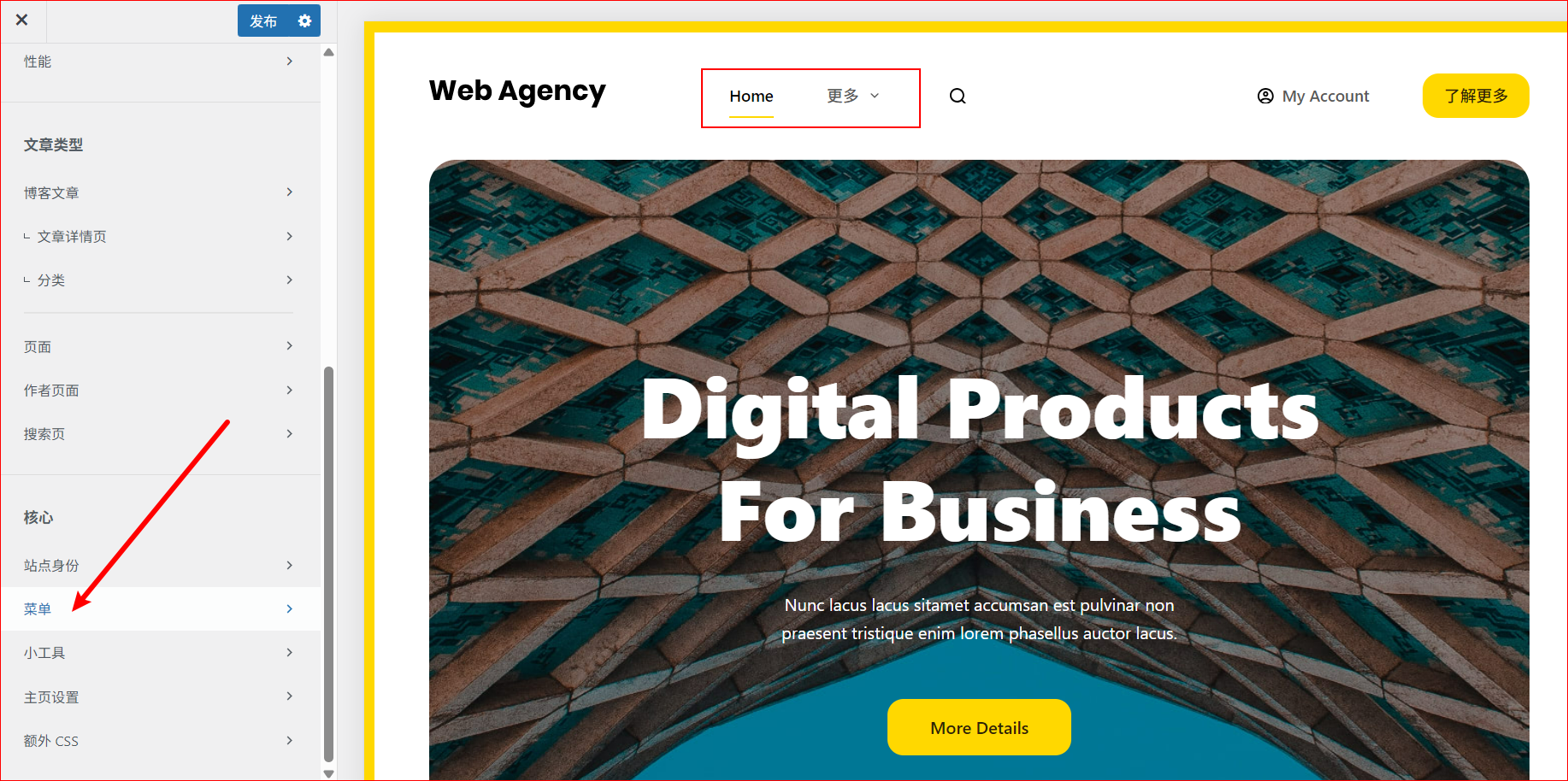 在自定义编辑页面,左侧是编辑菜单,右侧是网站的外观效果。