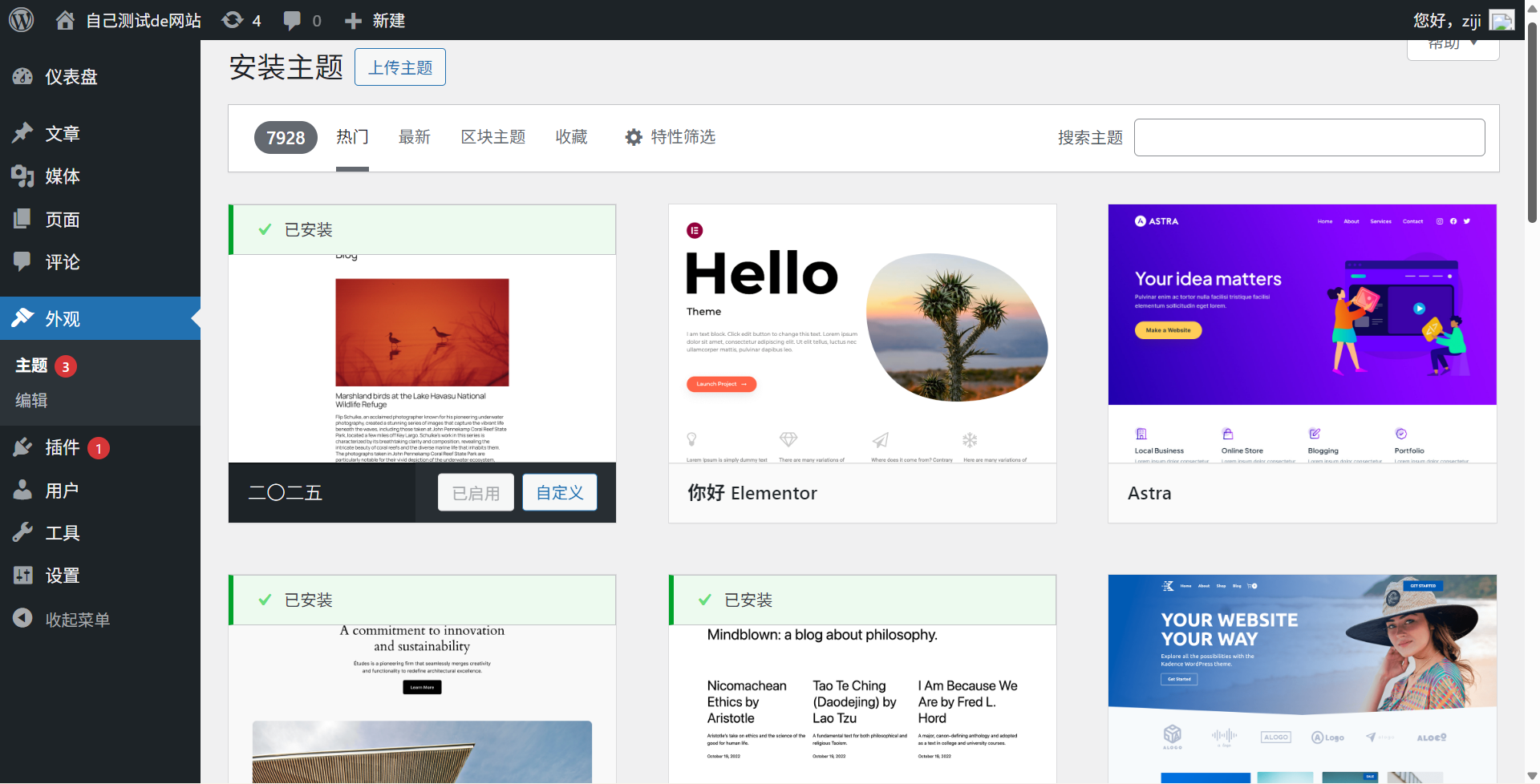 在管理后台,你可以点击左侧的"外观"菜单,进入主题列表。主题决定了您网站的外观。这里默认启用了一个2025的主题。你可以点击"安装主题",里面就会出现各种各样的主题。