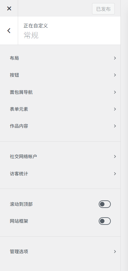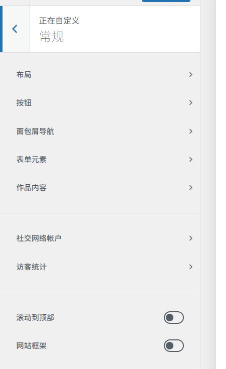 在"常规"选项中,还有两个开关,一个是"滚动到顶部",一个是"网站框架"。