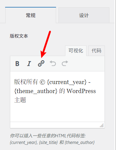 在版权信息里,你还可以回车空行,在底部写上网站的备案号。根据工信部的要求,点击顶部的"超链接"按钮,给备案号添加上超链接,跳转到工信部的备案管理系统。如果你的网站不用做域名备案,也可以不需要这一行内容。