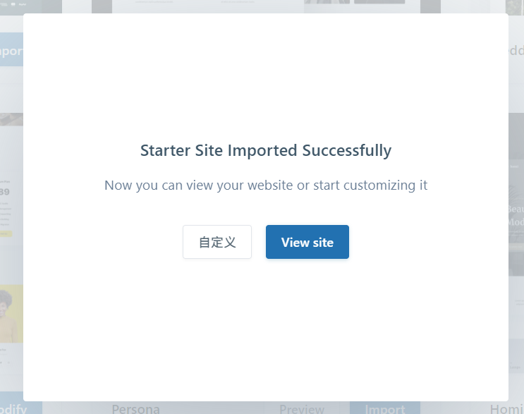 弹窗提示"Starter Site Imported Successfully"(初始站点导入成功),点击"View Site"(查看网站)。