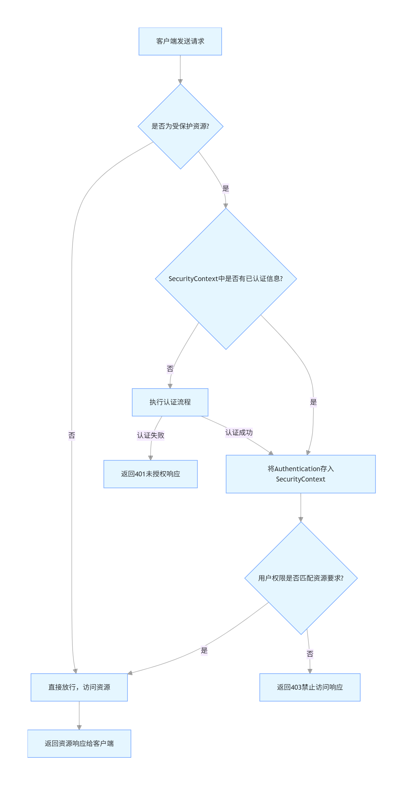 SpringSecurity 的工作流程本质是「Filter 链的执行流程」,分为「认证流程」和「授权流程」两个阶段。以下结合时序图,完整拆解请求的流转过程。