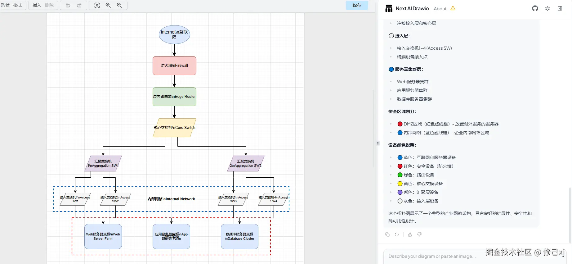 - 自然语言生成图表:用对话的方式描述你的需求,AI自动生成相应的draw.io图表