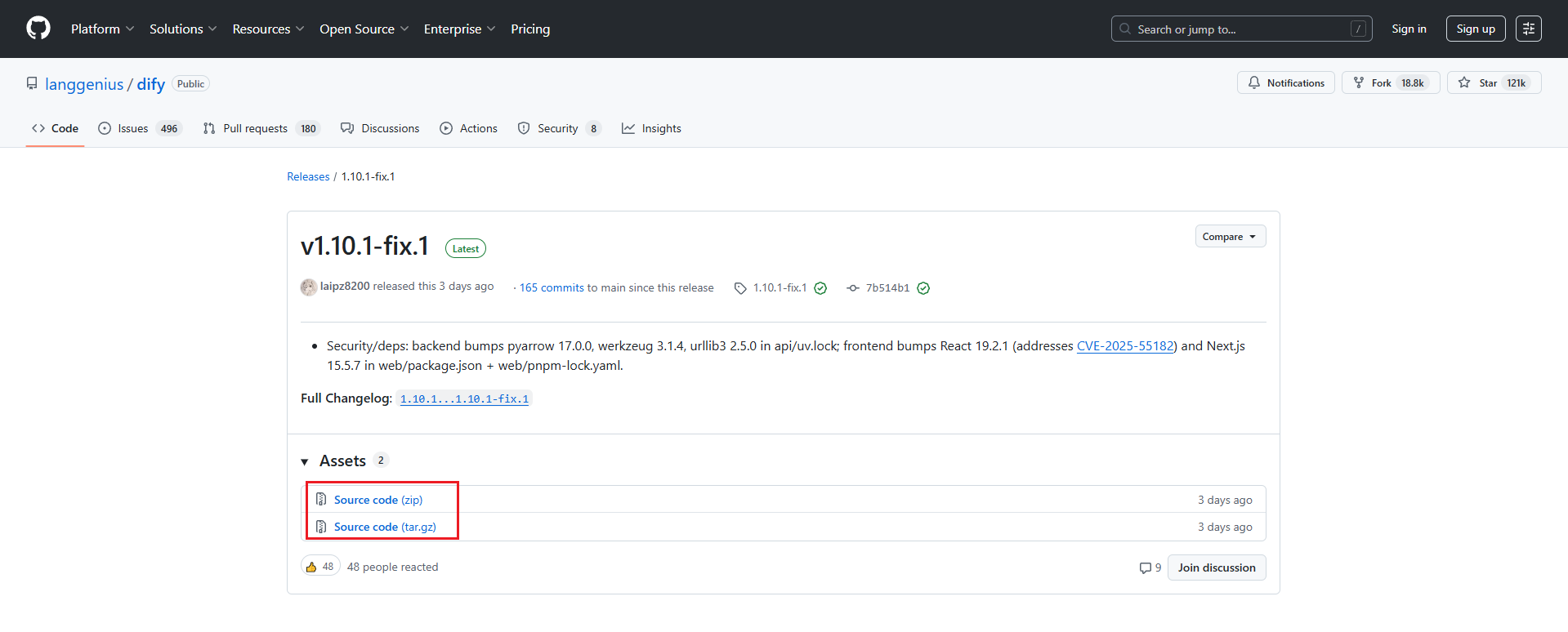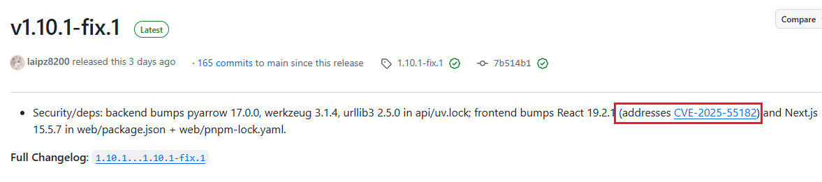 经过排查漏洞是来自于Dify,Dify官方也是很给力,很快发布了v1.10.1-fix来修复这两个漏洞
