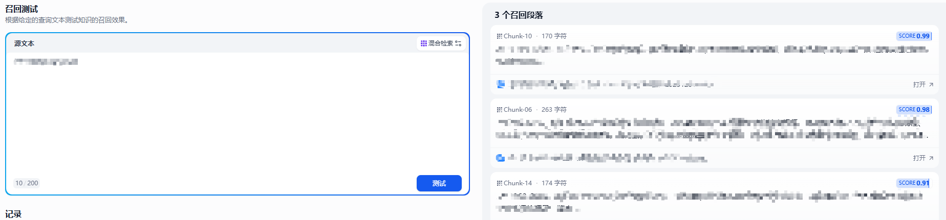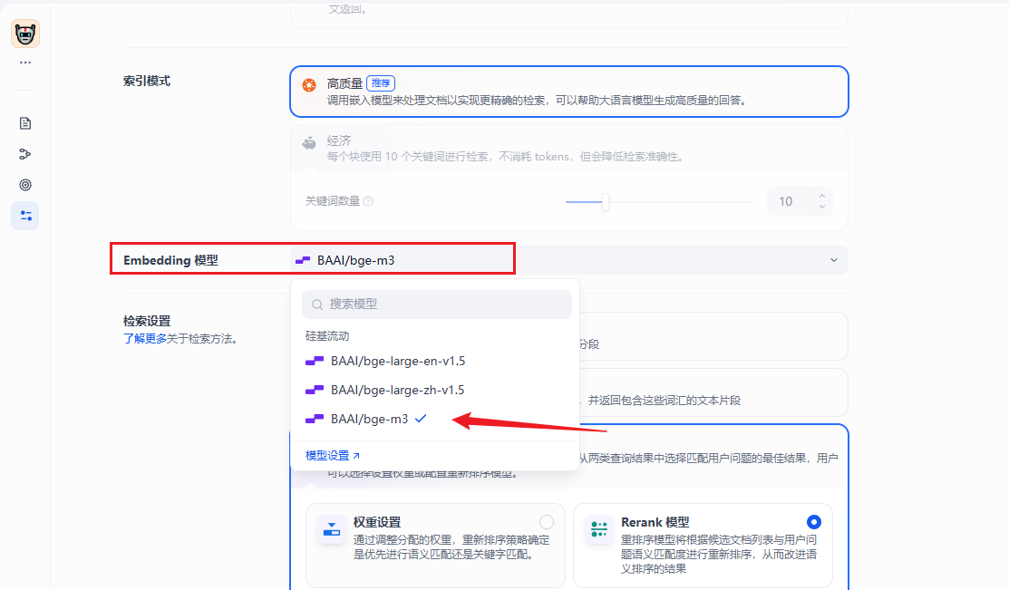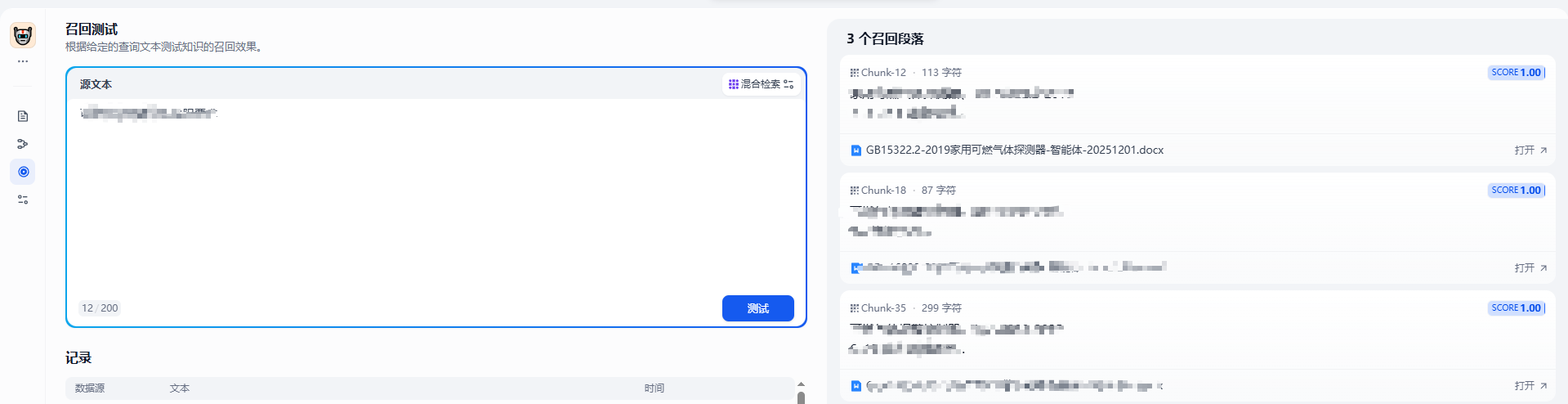 我们在把嵌入模型BAAI/bge-large-en-v1.5改回为BAAI/bge-m3保存,再次召回测试就正常了
