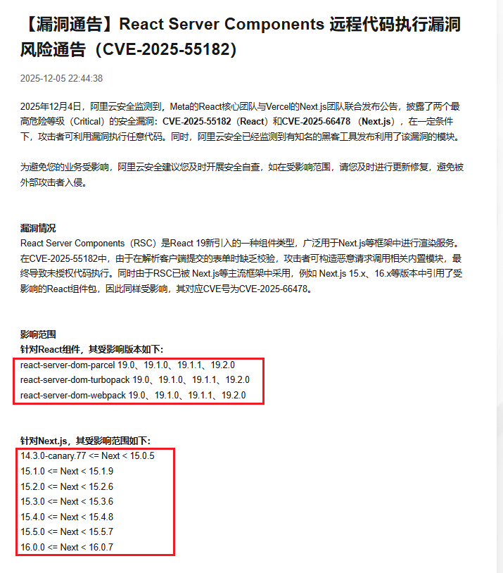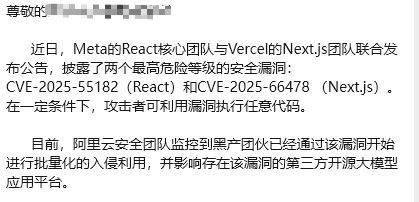 一大早就收到阿里云通知的CVE-2025-55182(React)和CVE-2025-66478 (Next.js)漏洞风险通知,