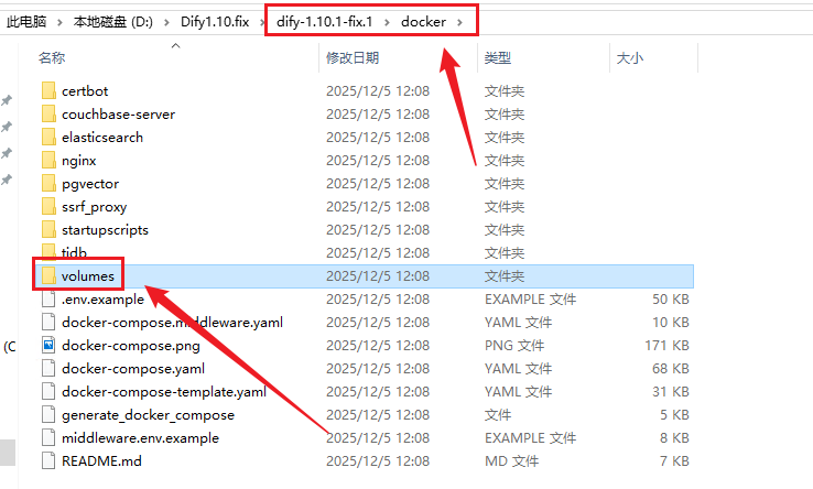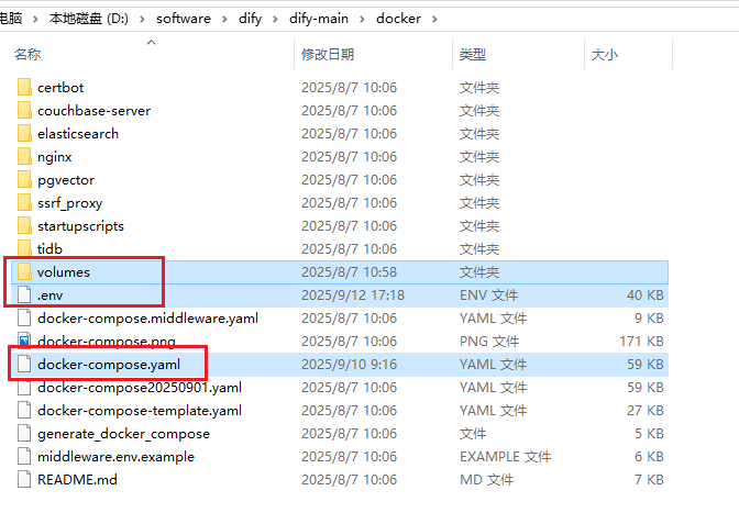 volumes目录是数据目录.env文件是dify的环境配置docker-compose.yaml文件是Docker Compose启动dify的配置文件