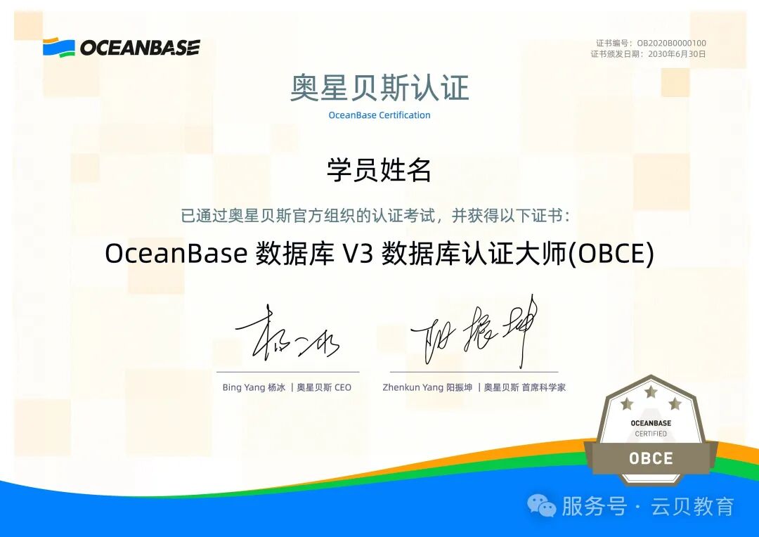 考试要求:需先通过 OBCA、OBCP 认证,具备丰富 OceanBase 运维实操经验。