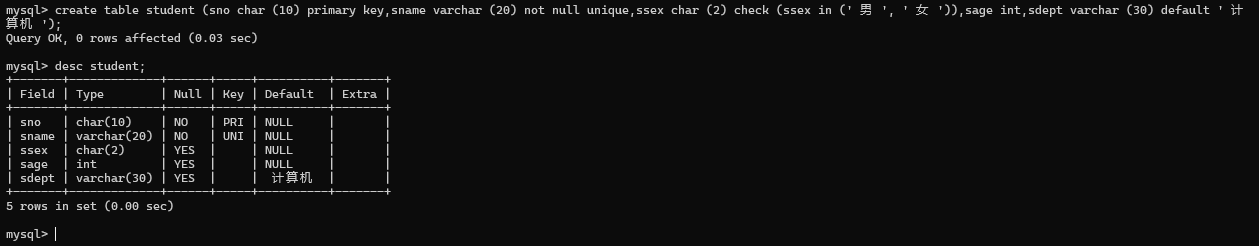 create table student (sno char (10) primary key,sname varchar (20) not null unique,ssex char (2) check (ssex in (' 男 ', ' 女 ')),sage int,sdept varchar (30) default ' 计算机 ');
