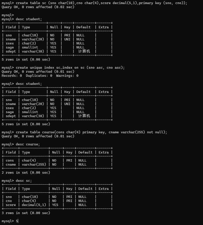 create table sc (sno char(10),cno char(4),score decimal(5,1),primary key (sno, cno));