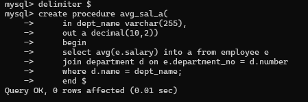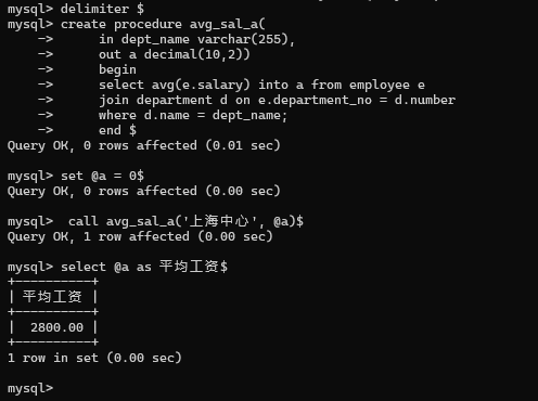 1、创建一个存储过程avg_sal_a,有2个参数,分别是部门名称dept_name及接收平均工资,