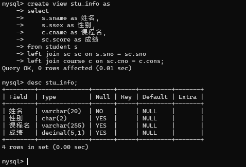 4.创建一视图 stu_info,查询全体学生的姓名,性别,课程名,成绩。