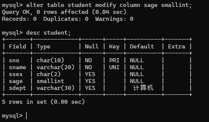 alter table student modify column sage smallint;