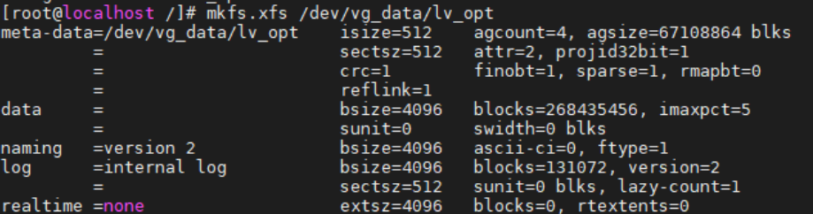 - 使用【mkfs.xfs /dev/vg_data/lv_opt】格式化逻辑卷