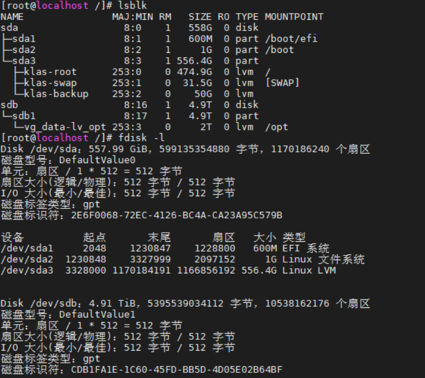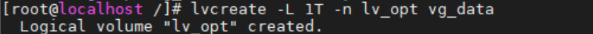 - 使用【lvcreate -L 1T -n lv_opt vg_data】创建逻辑卷(lv_opt是计划分配的路径加lv_固定前缀。1T是创建逻辑卷时指定的逻辑卷大小,可根据实际情况及需要调整)